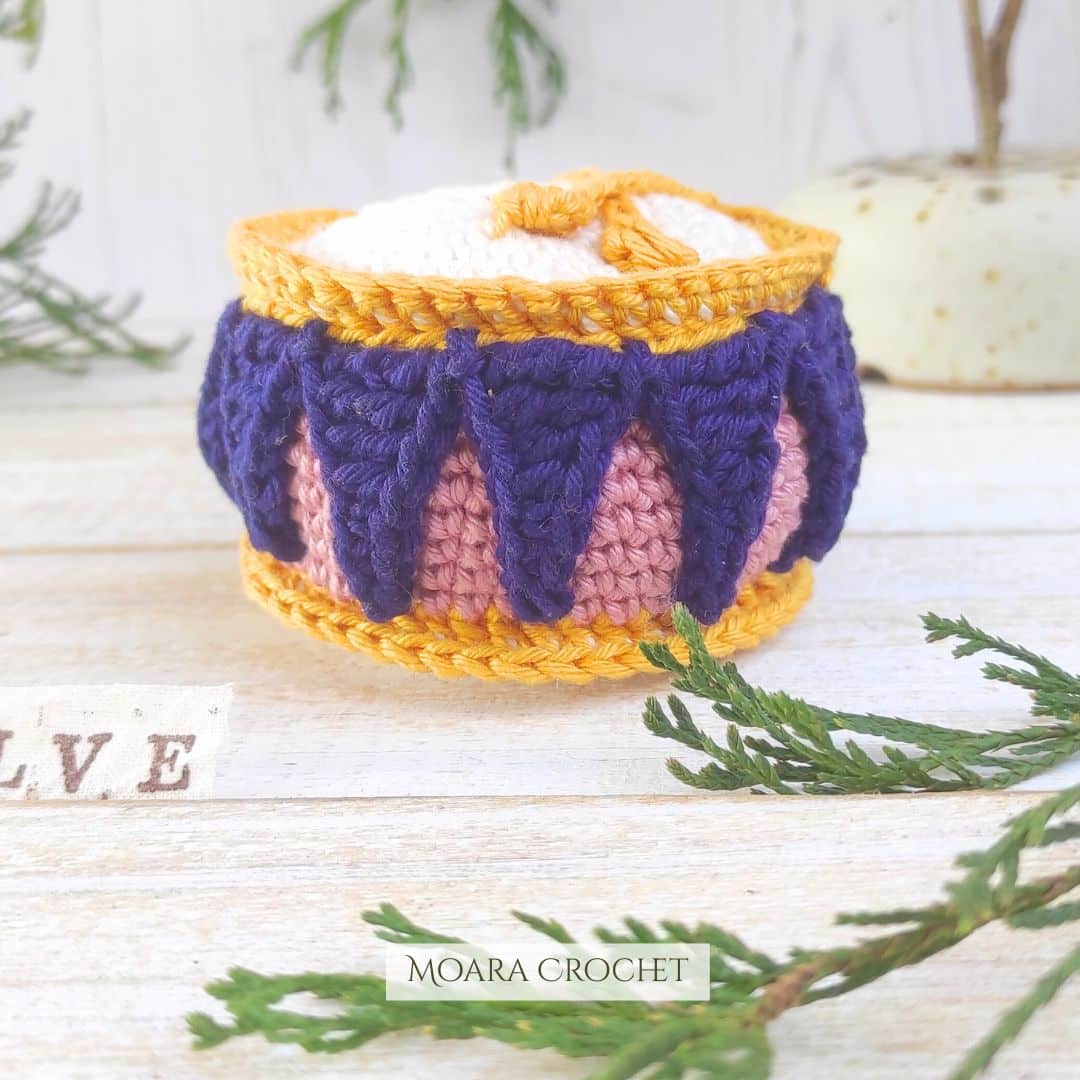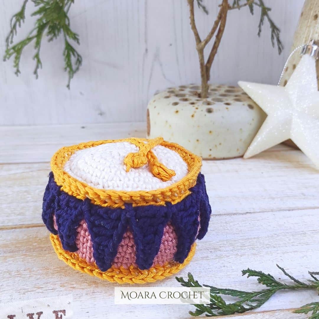 In this pattern, you’ll learn how to crochet a 3D drum with beautiful triangular detailing around the sides and raised gold accents that mimic the metal joins of a traditional drum. To finish, you’ll create a pair of miniature drumsticks, delicately crossed on top in an X formation for the perfect festive touch.